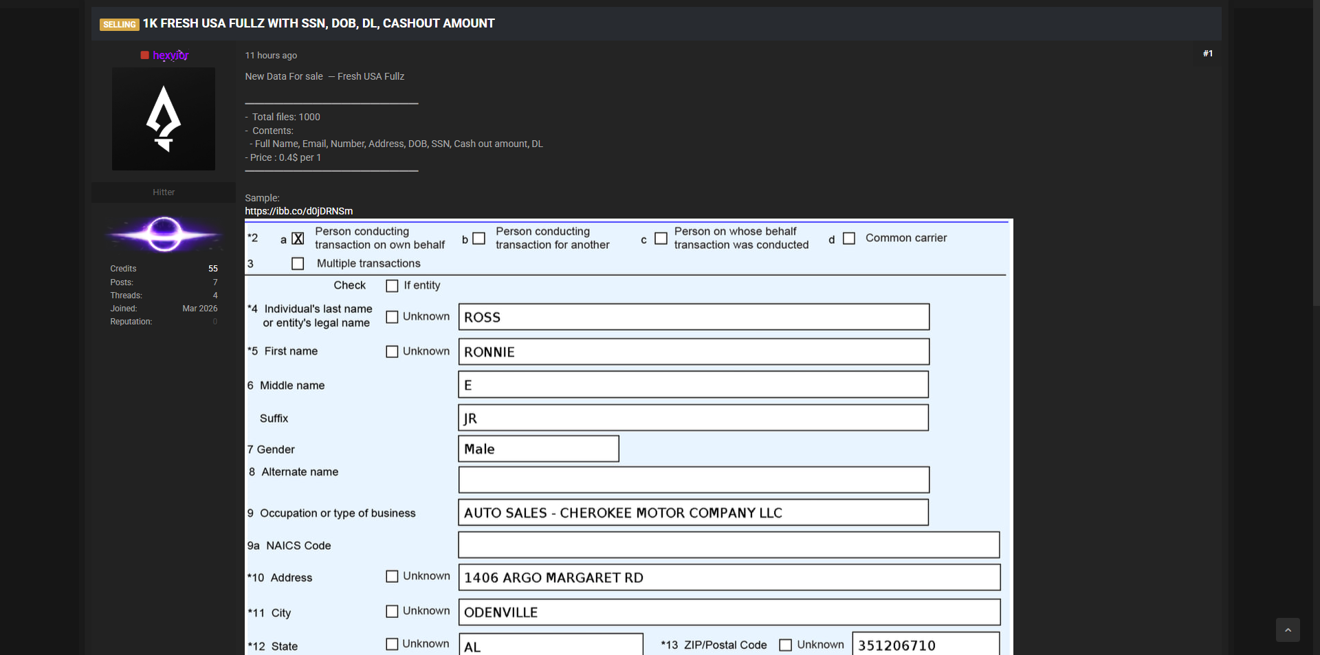 威胁行为者据称在黑客论坛上出售1000条新鲜美国Fullz(完整个人信息包)。这些数据为最新采集的美国公民信息,包含全名、电子邮件、电话号码、地址、出生日期、社会安全号码、驾照信息及提现金额等敏感字段。每条售价0.45美元,并提供样本数据及下载链接。