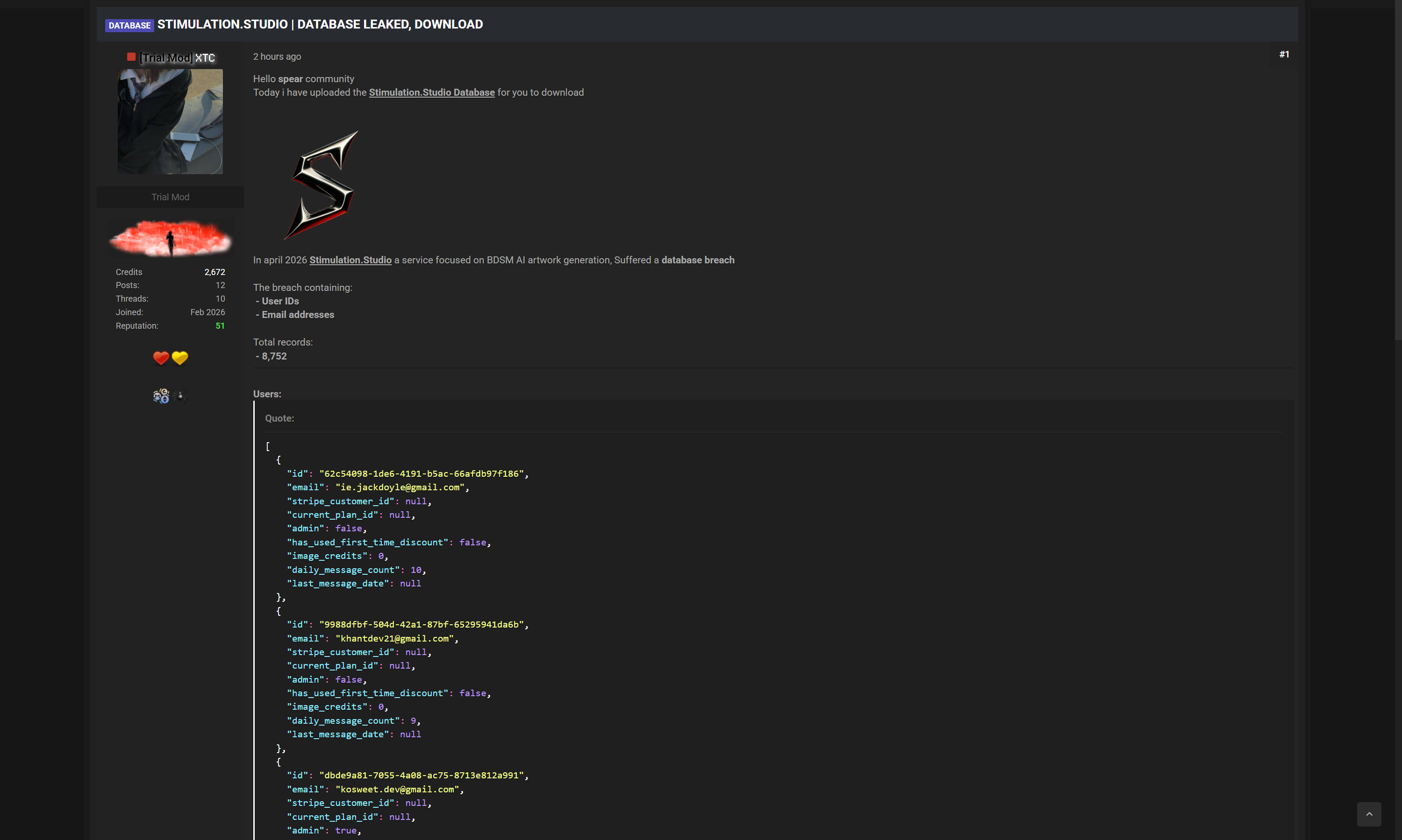 黑客论坛曝光BDSM AI艺术生成平台Stimulation.Studio的完整数据库,共8752条用户记录,包含User IDs、Email addresses等敏感信息。