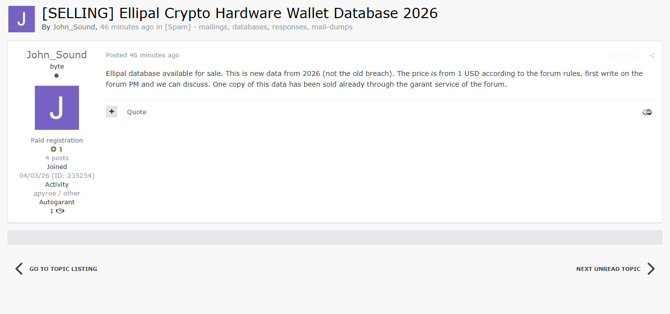 黑客论坛曝光Ellipal加密硬件钱包最新2026年数据库。该数据为全新泄露(非此前旧事件),已通过论坛担保服务售出一份,起价1美元。