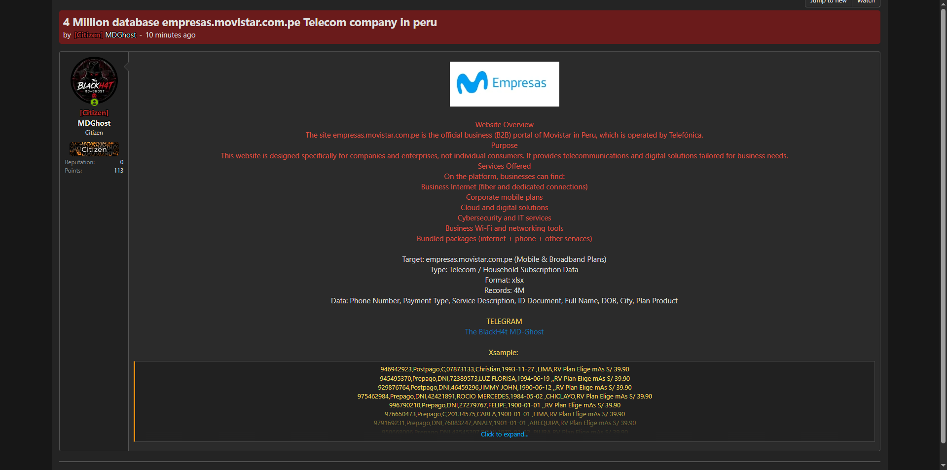 黑客论坛曝光秘鲁Movistar电信公司企业门户(empresas.movistar.com.pe)完整数据库,共400万条记录,泄露了电话号码、支付类型、服务描述、身份证件、完整姓名、出生日期、城市及套餐产品等企业与家庭客户敏感信息。