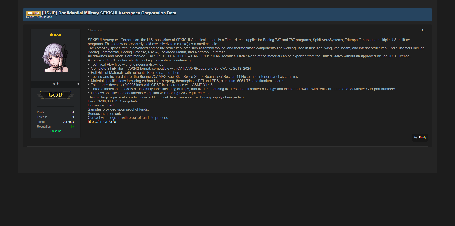 黑客论坛出售SEKISUI Aerospace Corporation(日本SEKISUI Chemical美国子公司)高度机密军事航空航天技术数据包,总量70GB。该公司是Boeing 737/787项目、Spirit AeroSystems及美国多个军事计划的一级直接供应商。