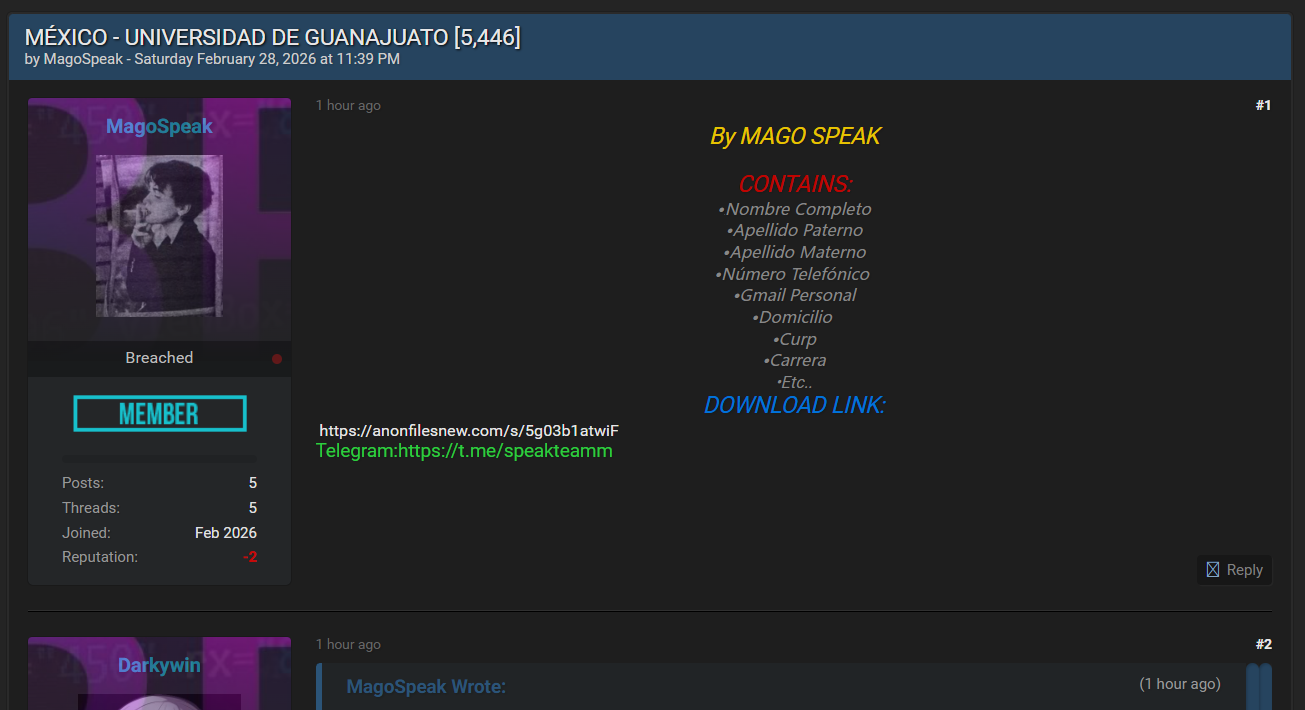 威胁行为者 MagoSpeak 于2026年2月28日在黑客论坛公开泄露数据包,声称来自墨西哥瓜纳华托大学(ugto.mx),泄露规模达5,446条学生/教职工个人信息。该大学是墨西哥知名公立高等学府,成立于1945年,拥有多个校区,主要提供本科、研究生教育及研究项目。