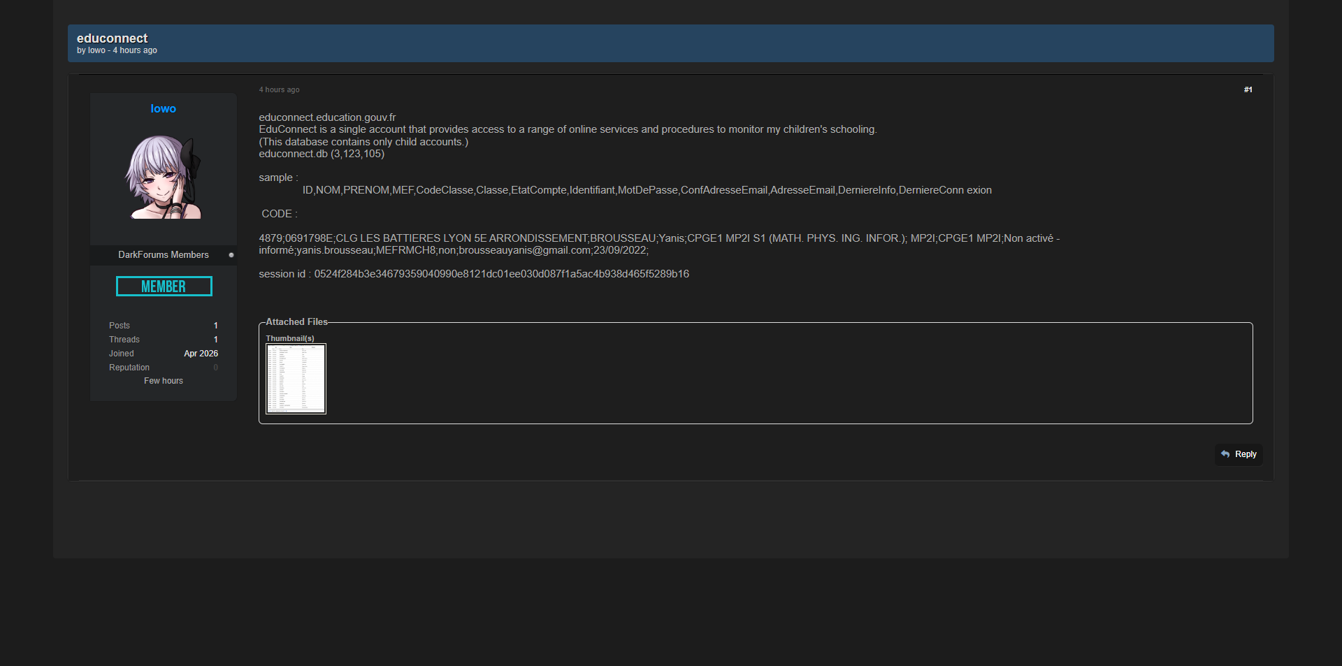 黑客论坛曝光法国EduConnect教育平台(educonnect.education.gouv.fr)数据库,该平台用于家长监控子女在校情况,泄露约3.12万儿童账户记录,包含大量学生个人信息及家长联系方式。
