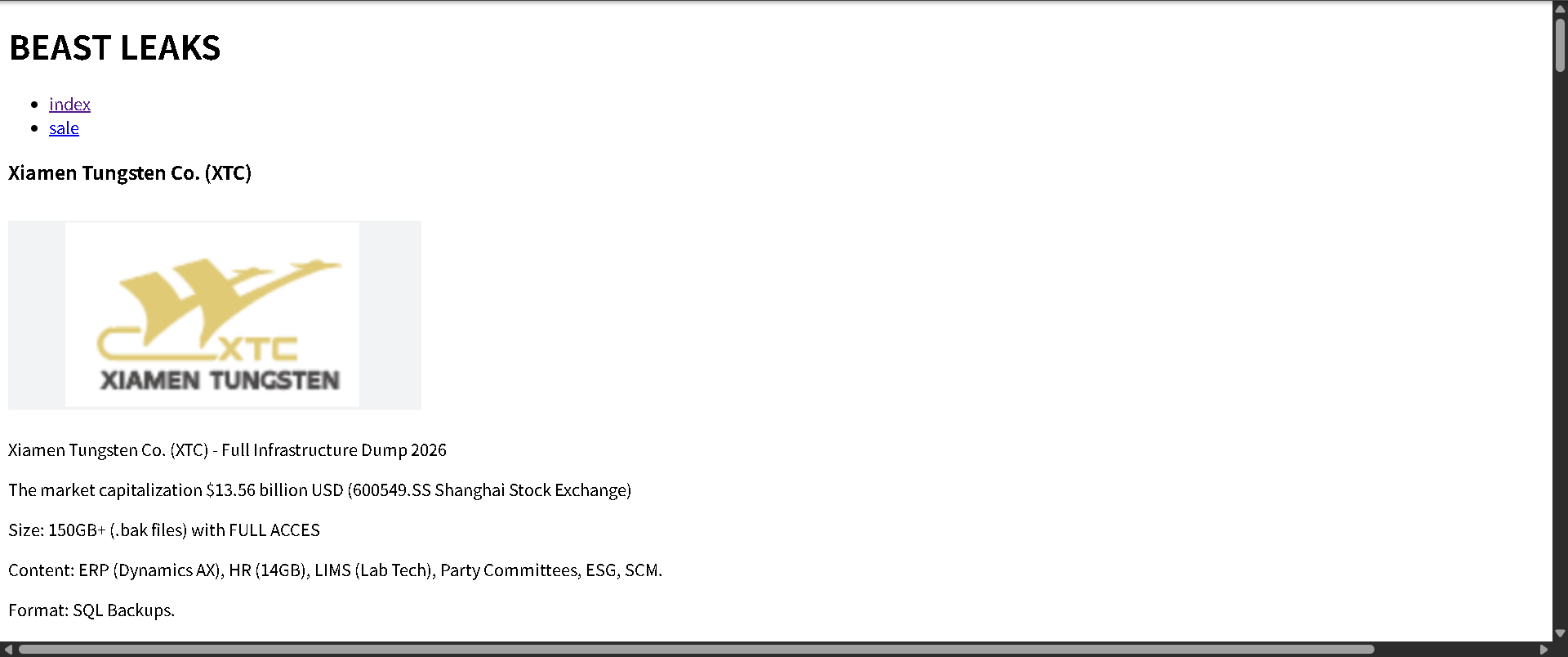 黑客论坛上出售某钨业公司的完整基础设施数据转储,包含ERP系统(Dynamics AX)、人力资源系统(14GB)、LIMS实验室技术系统、党委文件、ESG报告、SCM供应链管理系统等核心业务数据,总大小150GB+,全部为SQL备份文件,可完全访问。