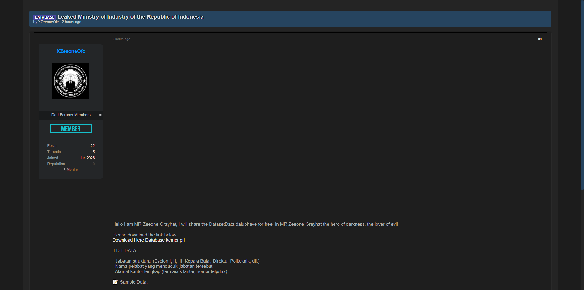 黑客论坛发布印度尼西亚工业部(Kementerian Perindustrian)完整官员数据库,包含大量高级官员职务、姓名以及完整办公地址(街道、楼层、电话/传真号码)等敏感信息。