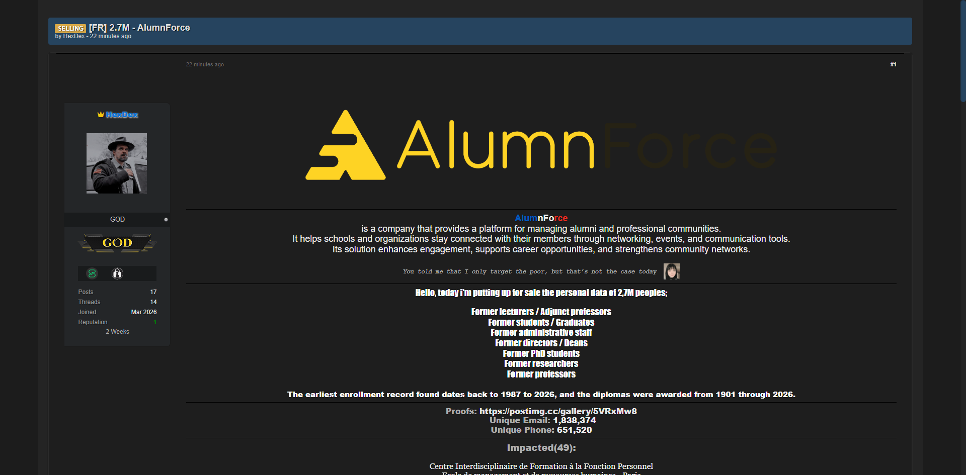 黑客论坛出售法国AlumnForce校友与专业社区管理平台270万条完整个人数据,该平台服务于学校及机构,用于校友联网、活动组织及职业发展支持,泄露记录覆盖1987-2026年入学信息及1901-2026年学位授予数据。
