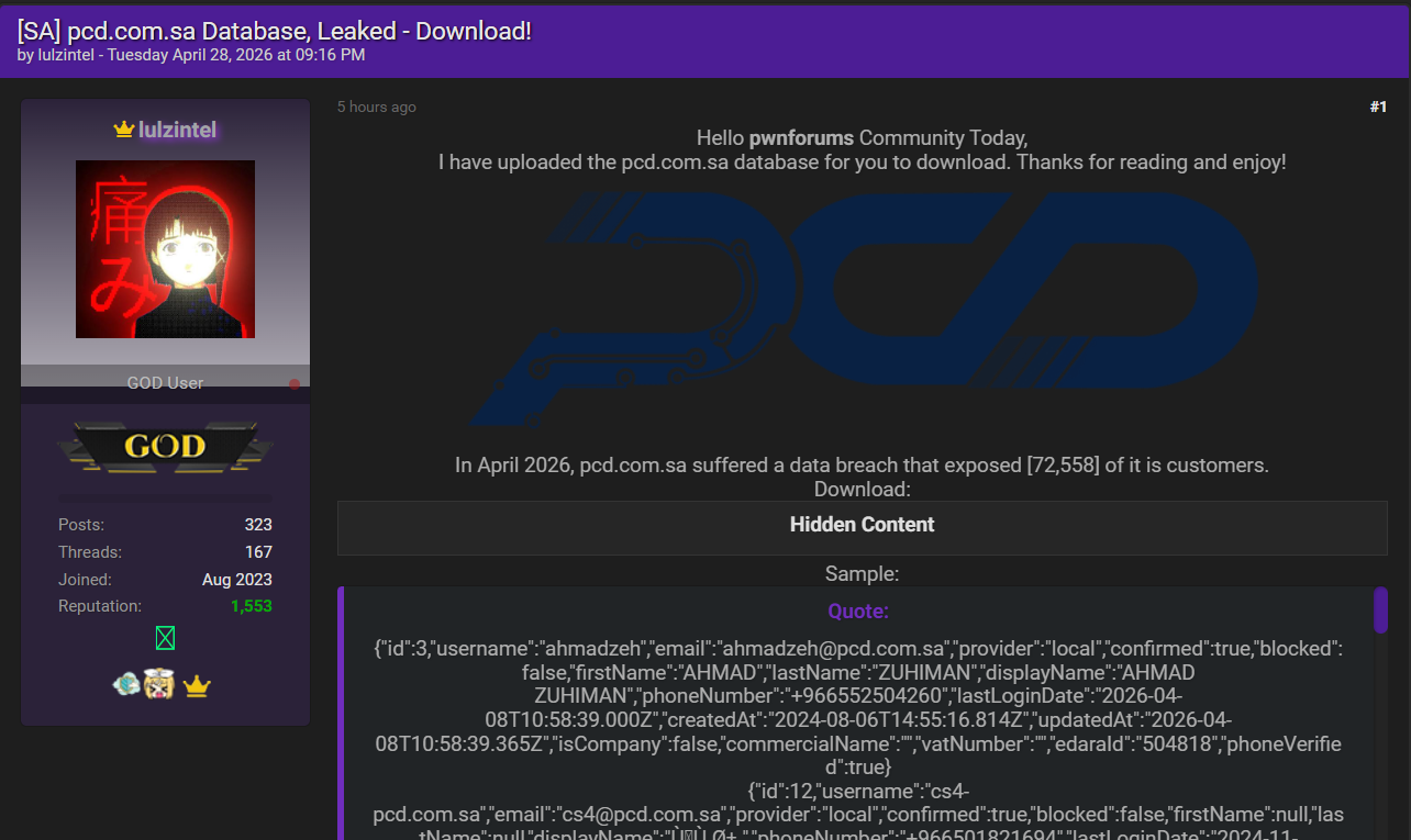黑客论坛曝光沙特阿拉伯PCD公司(pcd.com.sa)完整客户数据库,共7.2万条记录,泄露了用户名、邮箱地址、姓名、电话号码、账户创建时间、VAT税号等敏感个人信息。