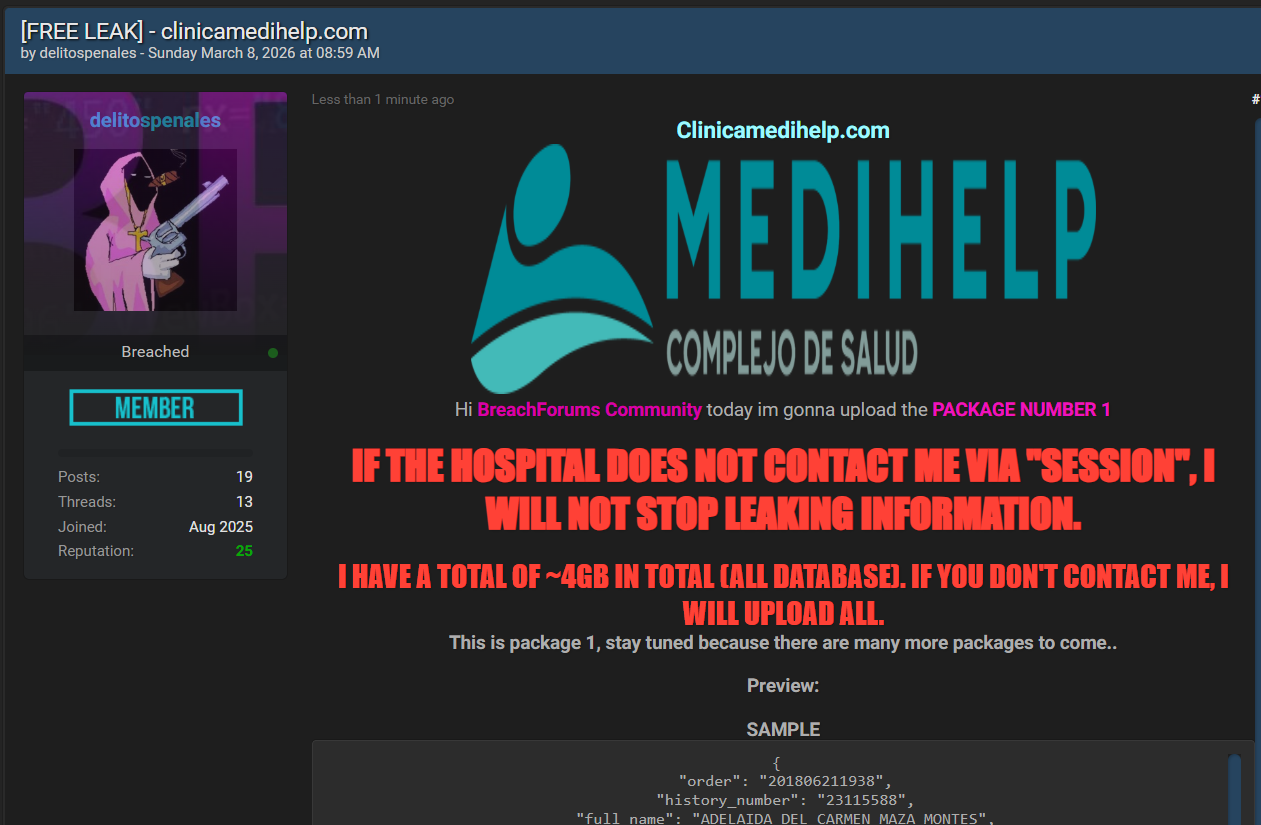 此次事件暴露了墨西哥私立医疗综合体在数据安全与网络防护方面的严重缺失。Clinica Medihelp处理大量患者病例、诊断、治疗与计费信息,一旦约4GB数据被分包公开并用于勒索,将直接导致大规模健康隐私侵犯、身份盗用、医疗诈骗、敲诈勒索、保险欺诈与针对性歧视风险激增。