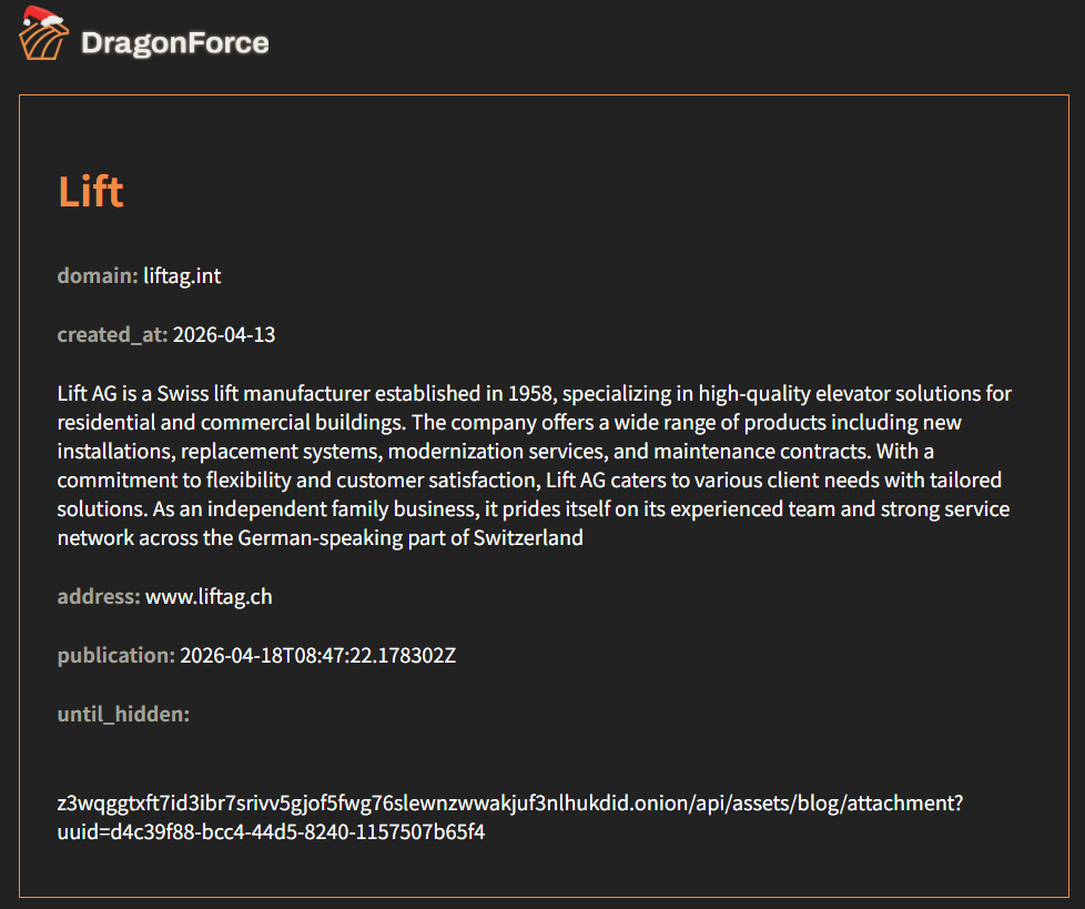 黑客论坛DragonForce曝光瑞士电梯制造商Lift AG完整公司数据记录,该公司成立于1958年,专注于为住宅和商业建筑提供高质量电梯解决方案,包括新安装、更换系统、现代化服务及维护合同,是德语区瑞士的独立家族企业。