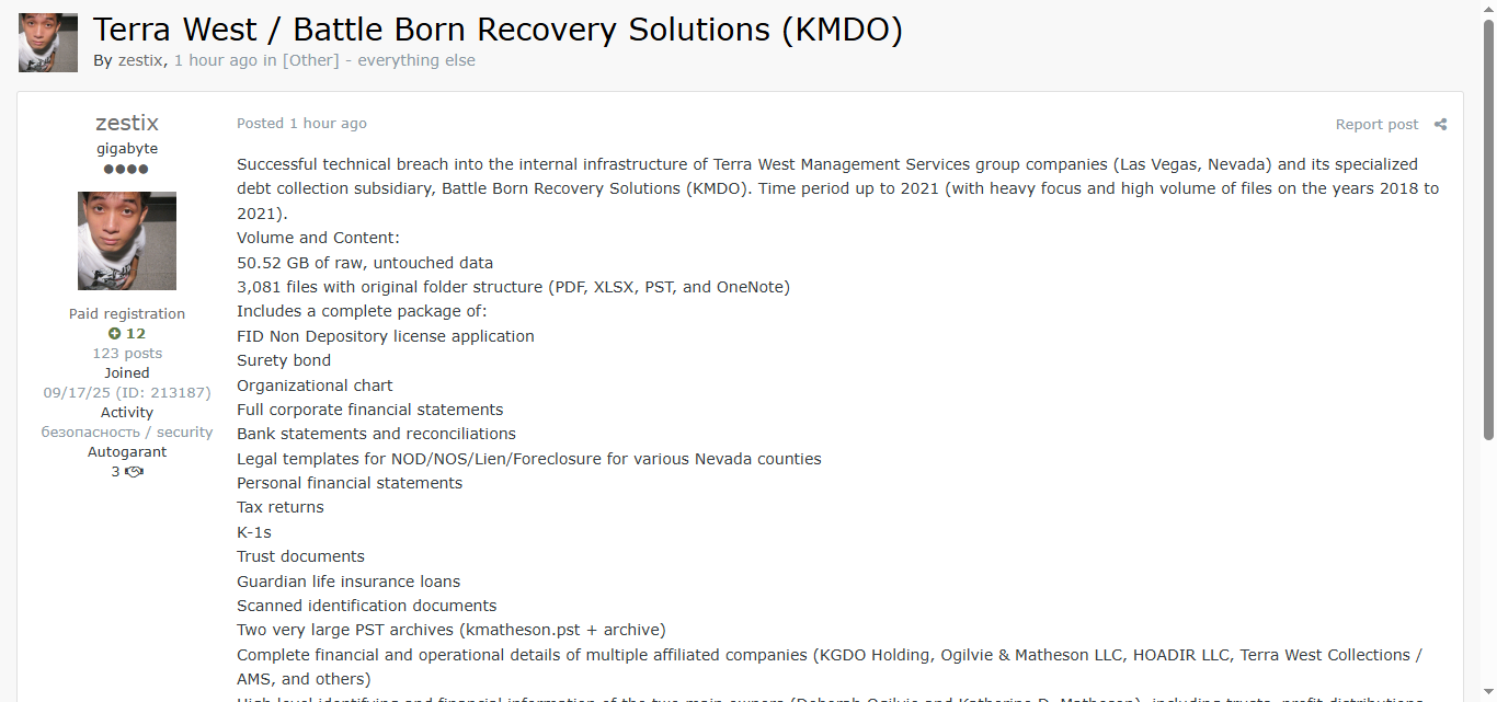 黑客论坛曝光美国内华达州拉斯维加斯Terra West Management Services集团及其债务催收子公司Battle Born Recovery Solutions(KMDO)内部基础设施数据,共50.52GB、3081个文件,主要涵盖2018-2021年财务、法律及个人敏感文档。